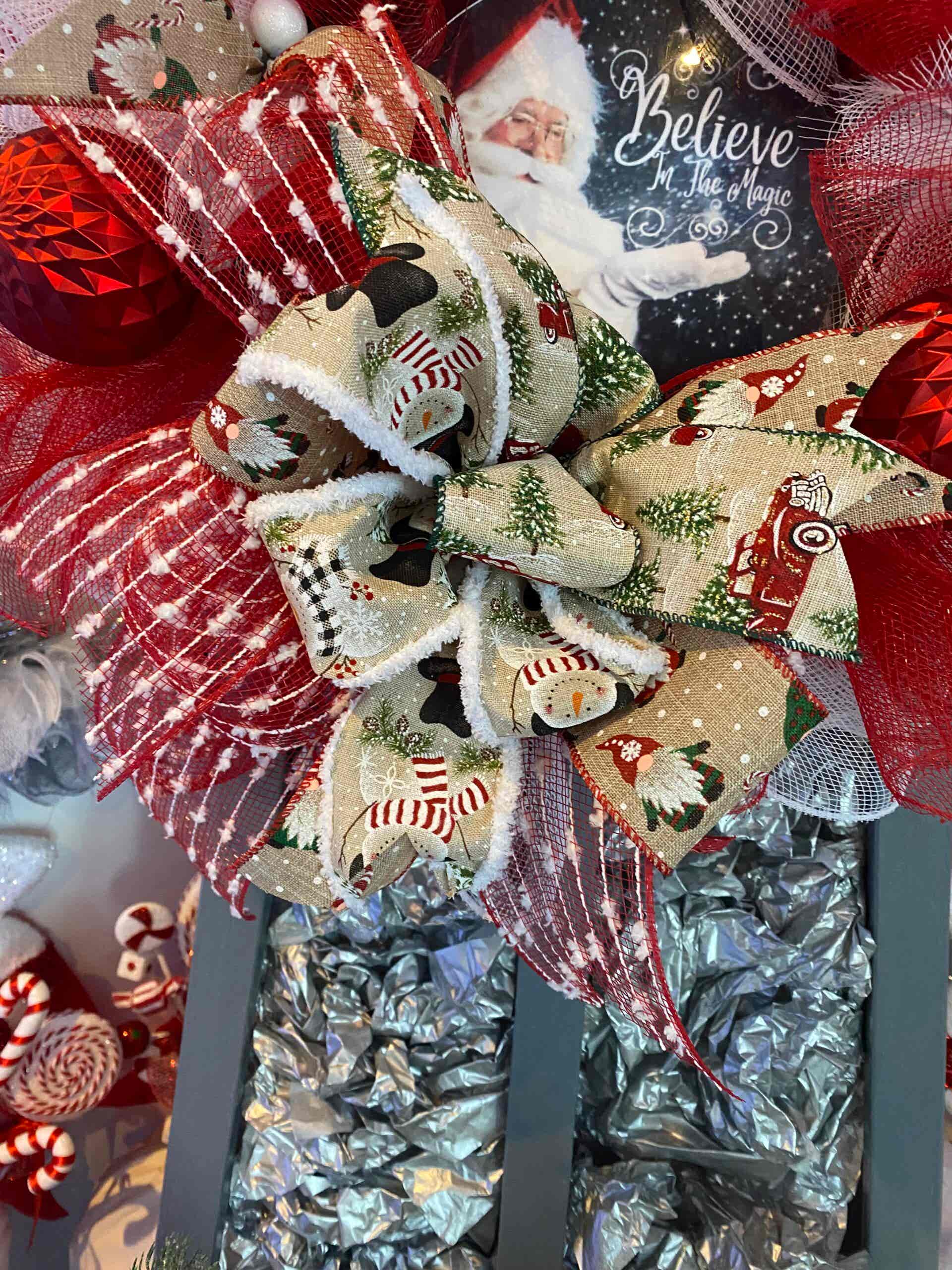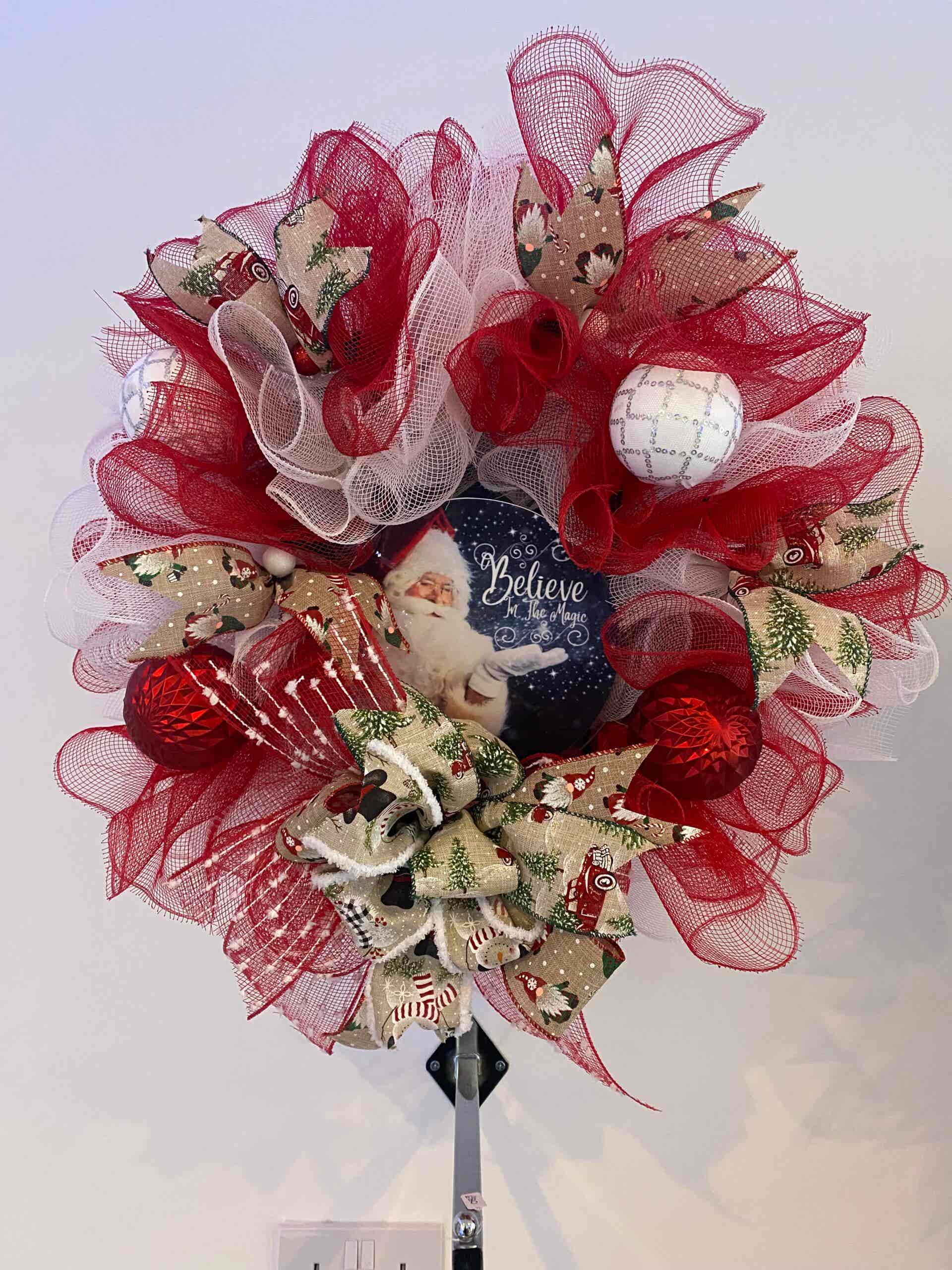 This stunning Christmas wreath displays a stunning Santa Clause decal of which can be personalised. The wreaths colour tones blend traditional Christmas shades of red and white beautifully with stunning golden character ribbons. The wreath would be made bespoke to each customers specification with regards to colours used in main body of wreath, ribbon colours and styles used. Or it can simply be purchased to be designed as near as possible to what is shown in the picture as each wreath is hand crafted to be a totally bespoke piece.