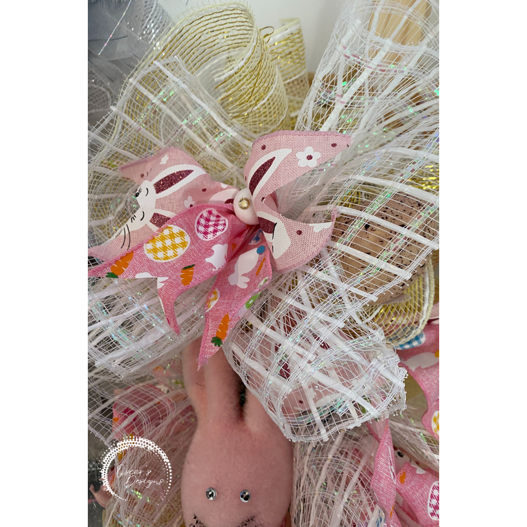 This wreath is the perfect way to add some flair to celebrate Easter. This Easter Bunny Soft Pink Dreams deco mesh wreath is perfect for Easter and welcoming of spring seasonal celebrations adding flair to the décor on the front door, sitting room or weather permitting Easter Sunday garden party.