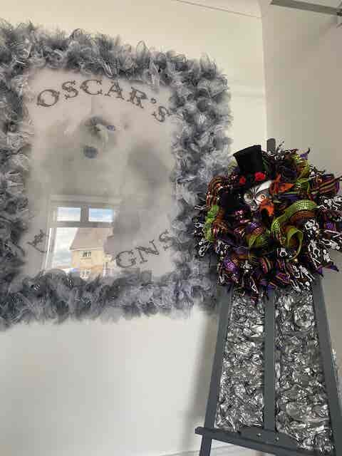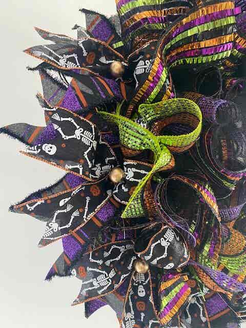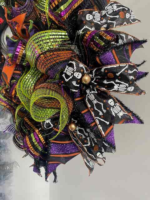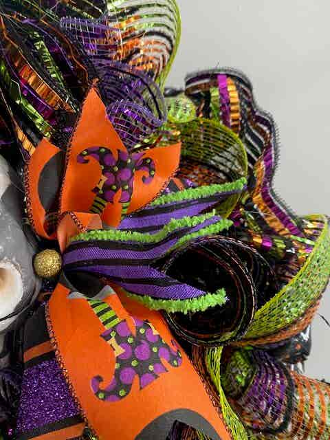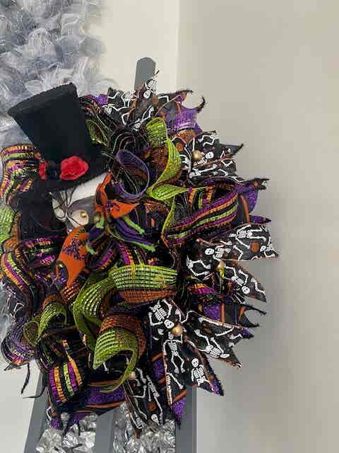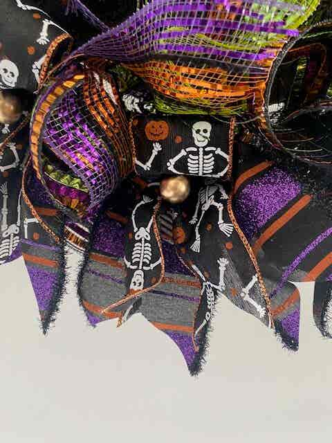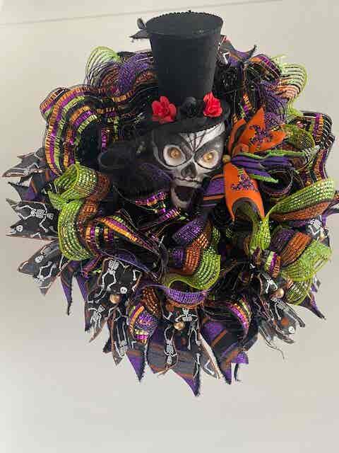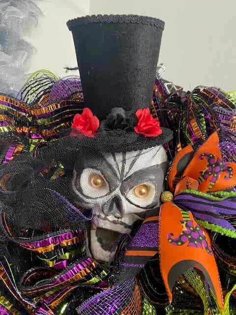 The wreath is adorned with gorgeous high sheen metallic mesh, stunning ribbons with a mixture of horizontal and vertical stripes, witches legs and a full skeleton finished off with his top hat and glittered pumpkins this ribbon is dressed with a small high shine golden ball.  The dramatic centre piece to this wreath houses a frightening skeleton skull adorning his flowered top hat. This wreath is the perfect way to add some flair to your Halloween festivities and is perfect for your Halloween décor with his dramatic menacing edge; don’t miss out on the opportunity to make your home stand out for this spooky season with this Halloween wreath.