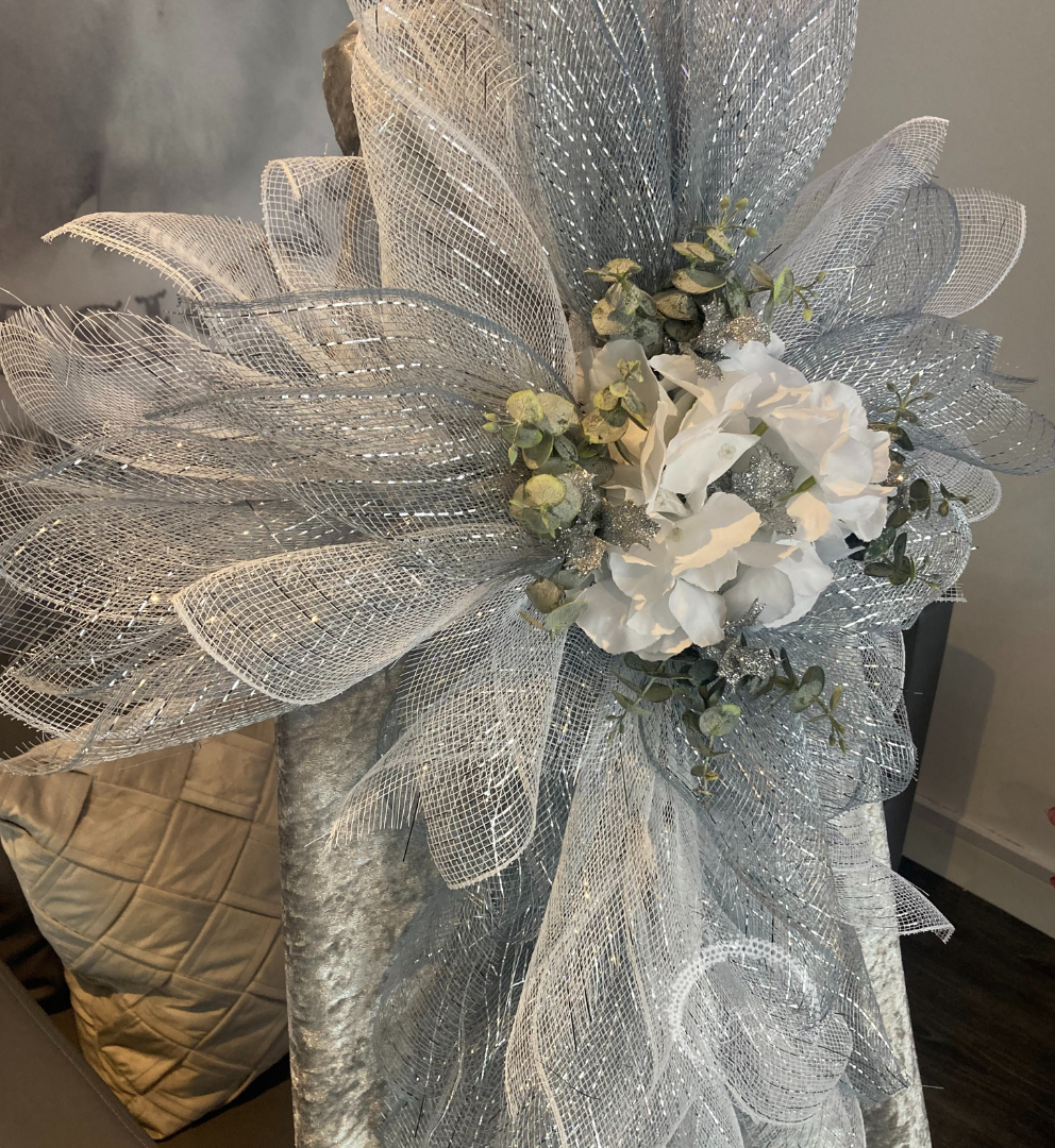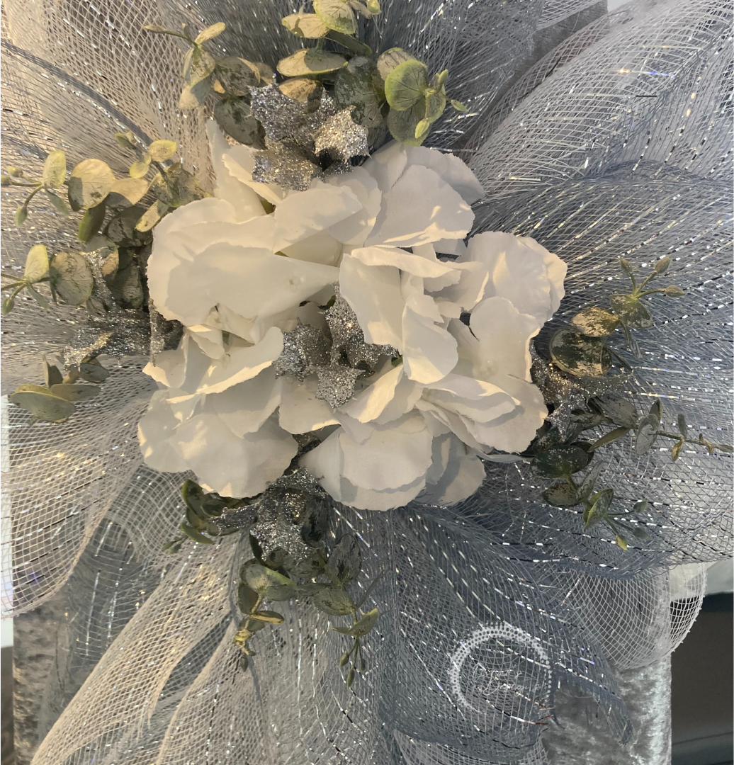 The Cross is adorned with a mixture of white and silver mesh, both with a high shine metallic weave running throughout. The Centre is inlayed with white florals and silver embellishments.