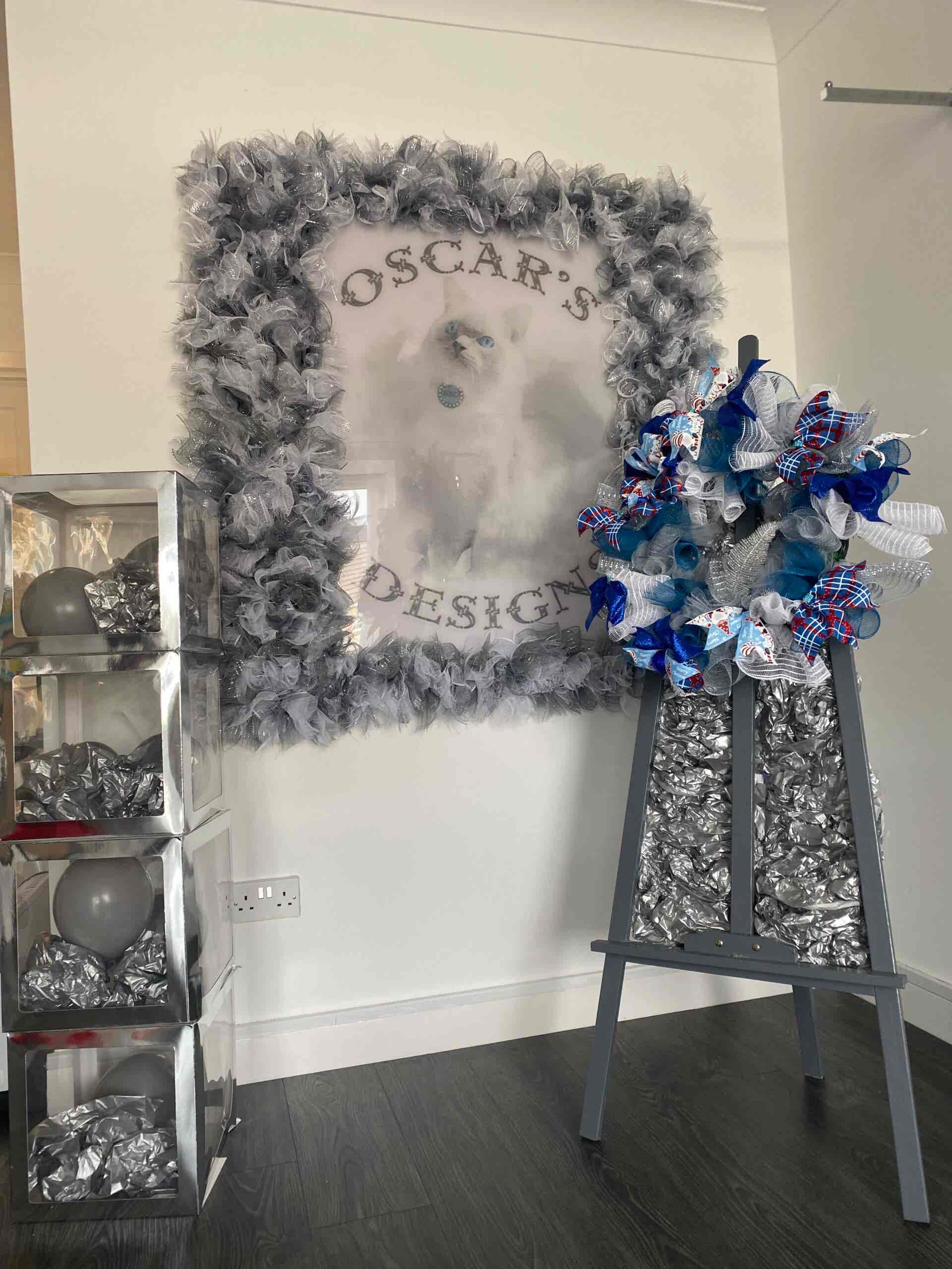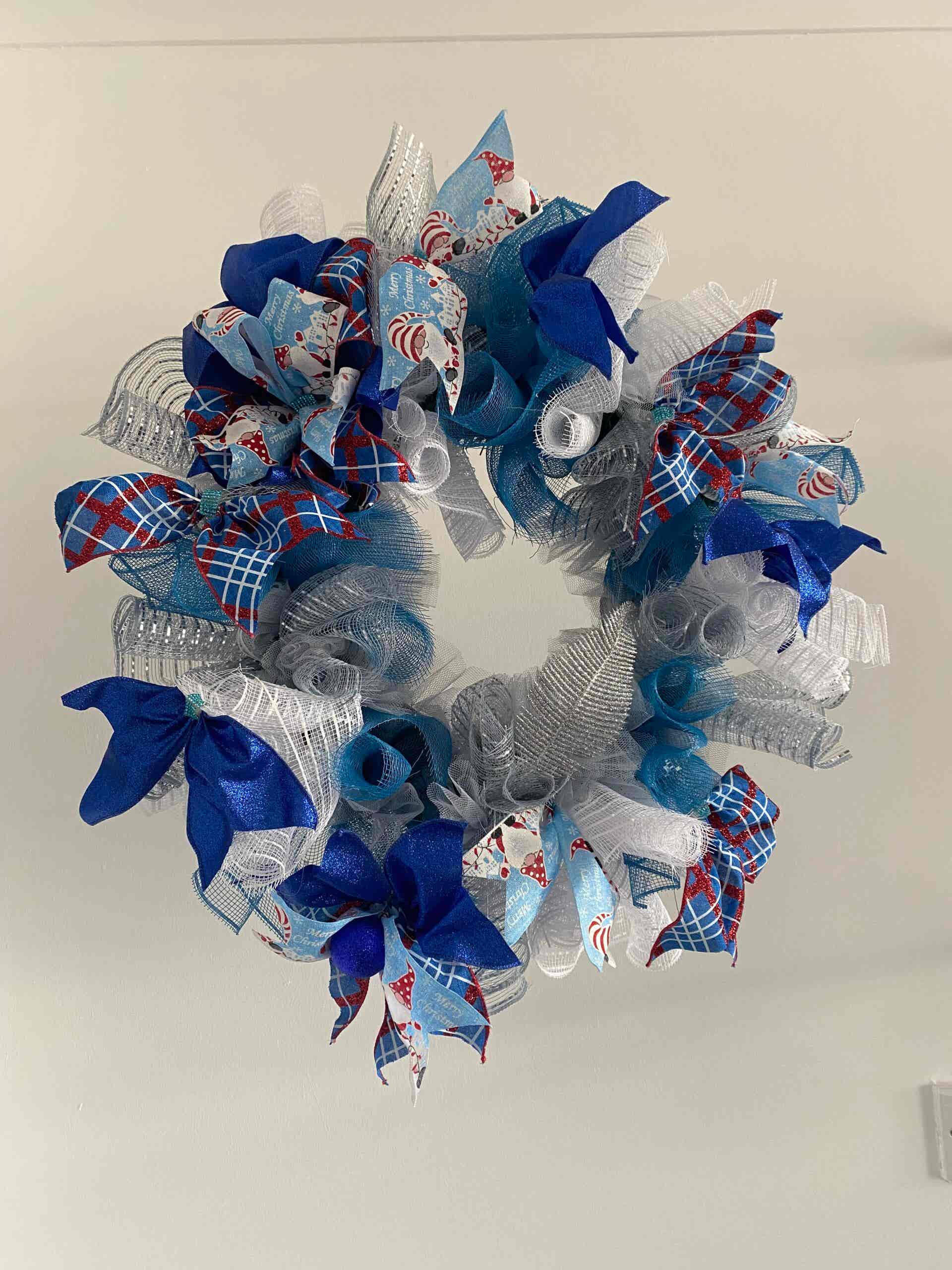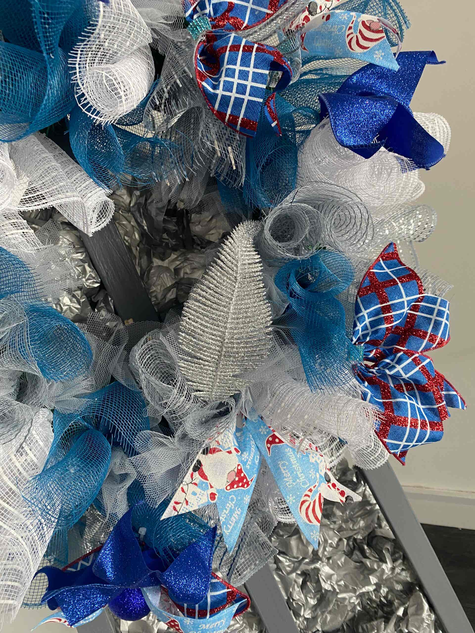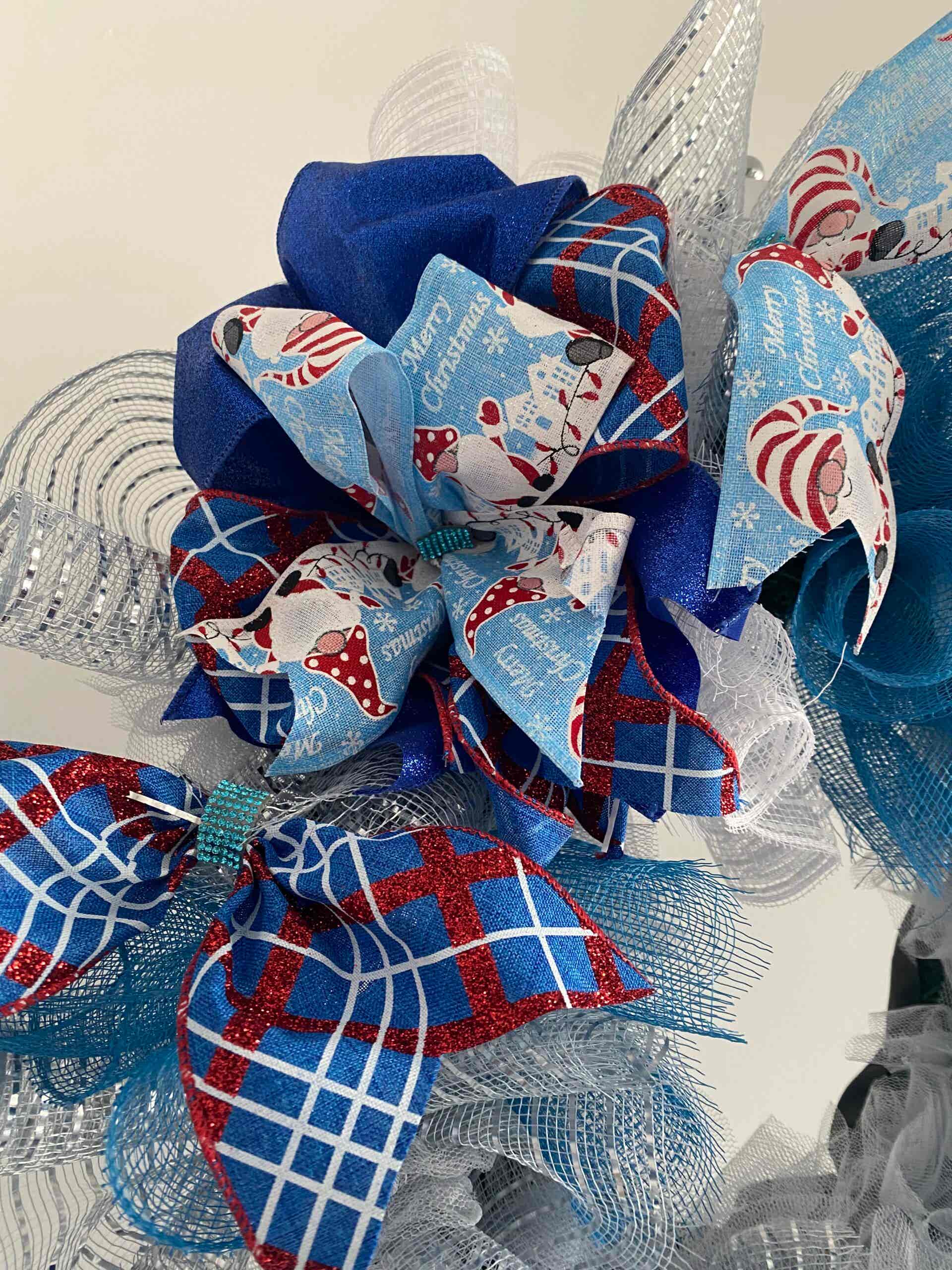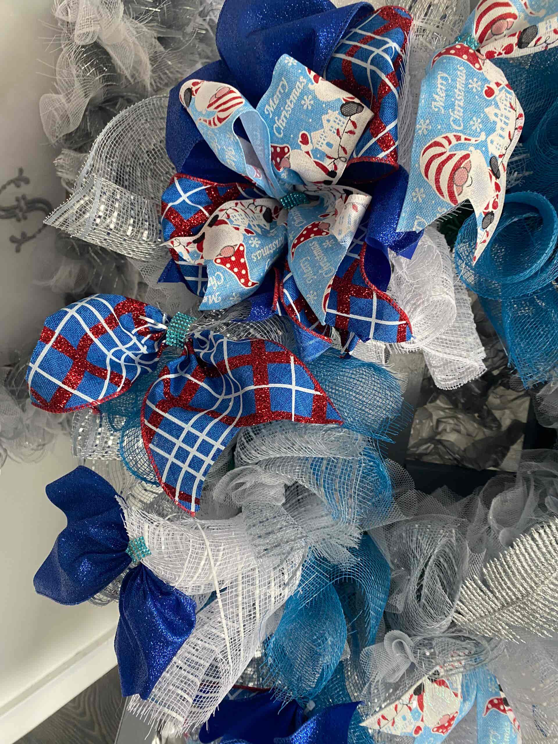 The wreath is adorned with a mixture of 3 mesh colours of a lovely block shade of blue, a white with a running white flex and silver with a metallic silver flex running throughout. Ribbons are equally of festive styling mixed with high shine metallic deep blue, metallic and matt fabrics, detailing a blue tartan style design with a white and high shine red pattern, and a beautifully soft light blue ribbon detailing a Christmas Gnok. Each selection of ribbon is finished off with stylish light blue diamantes allowing the ribbon embellishment to add some chic to these bold, soft colours and textures. A large sparkling silver fern also adds some chic to this festive wreaths design.
