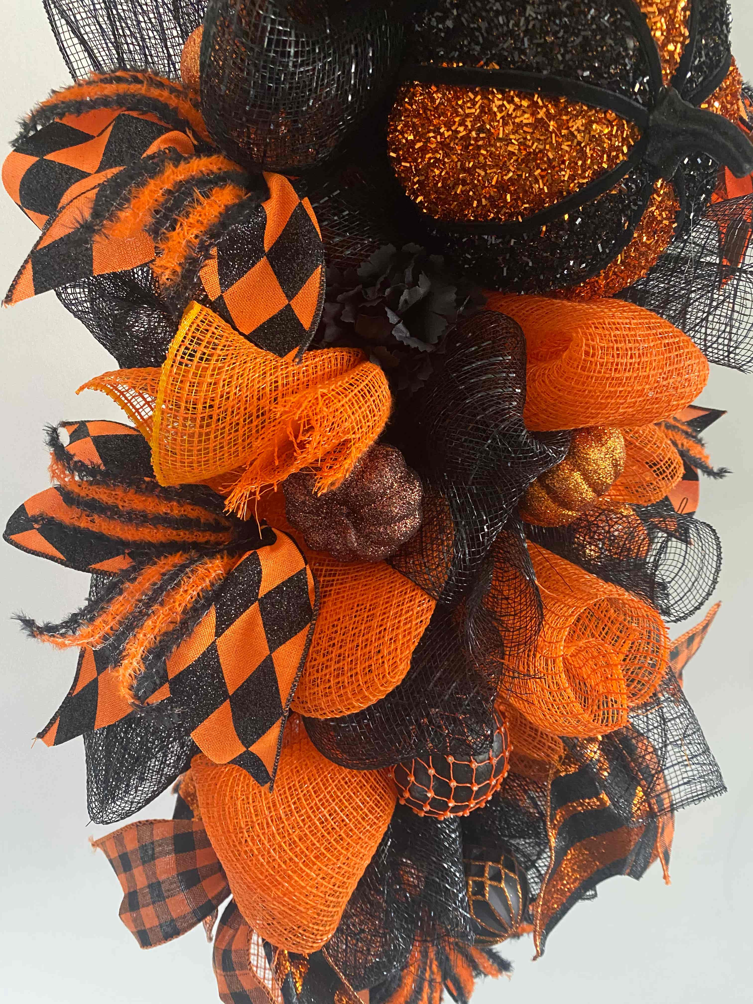 The wreath is adorned with traditional autumn colours with its black shimmering mesh and vibrant orange mesh, gorgeous vibrant shimmering ribbon tales in dramatic dazzling harlequin design matched with a stunning fuzzy orange and black stripped ribbon along with a shimmering chevron orange and black ribbon matched elegantly with a gingham pattern. The centre piece to this wreath is a dramatic large shimmering orange and black pumpkin with a mixture of smaller sparkling pumpkin’s, stunning diamanté domes, glittering Halloween baubles along with beautiful black foliage throughout which tops this Autum/Halloween seasonal wreath off with style. This wreath is the perfect way to add some flair to your Halloween festivities Tangy Orange & Black Delight decorative wreath is perfect for your Halloween seasons décor adding vibrance and style showing off the seasons main character of the Pumpkin, don’t miss out on the opportunity to make your home stand out for this Autumn season with this stunning wreath which could add style to your home right through to the festive season.