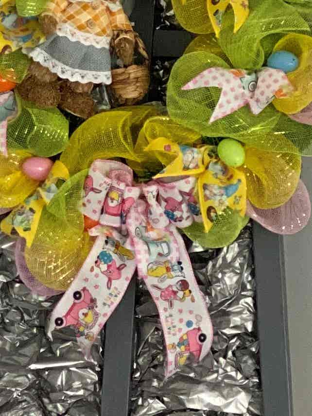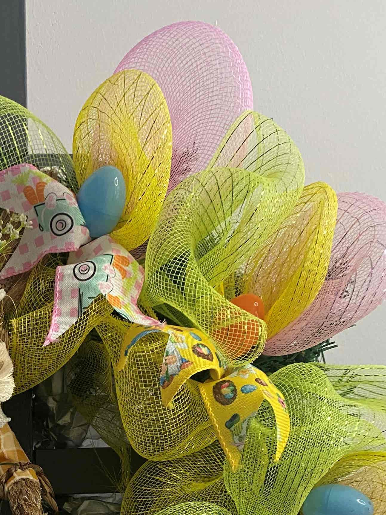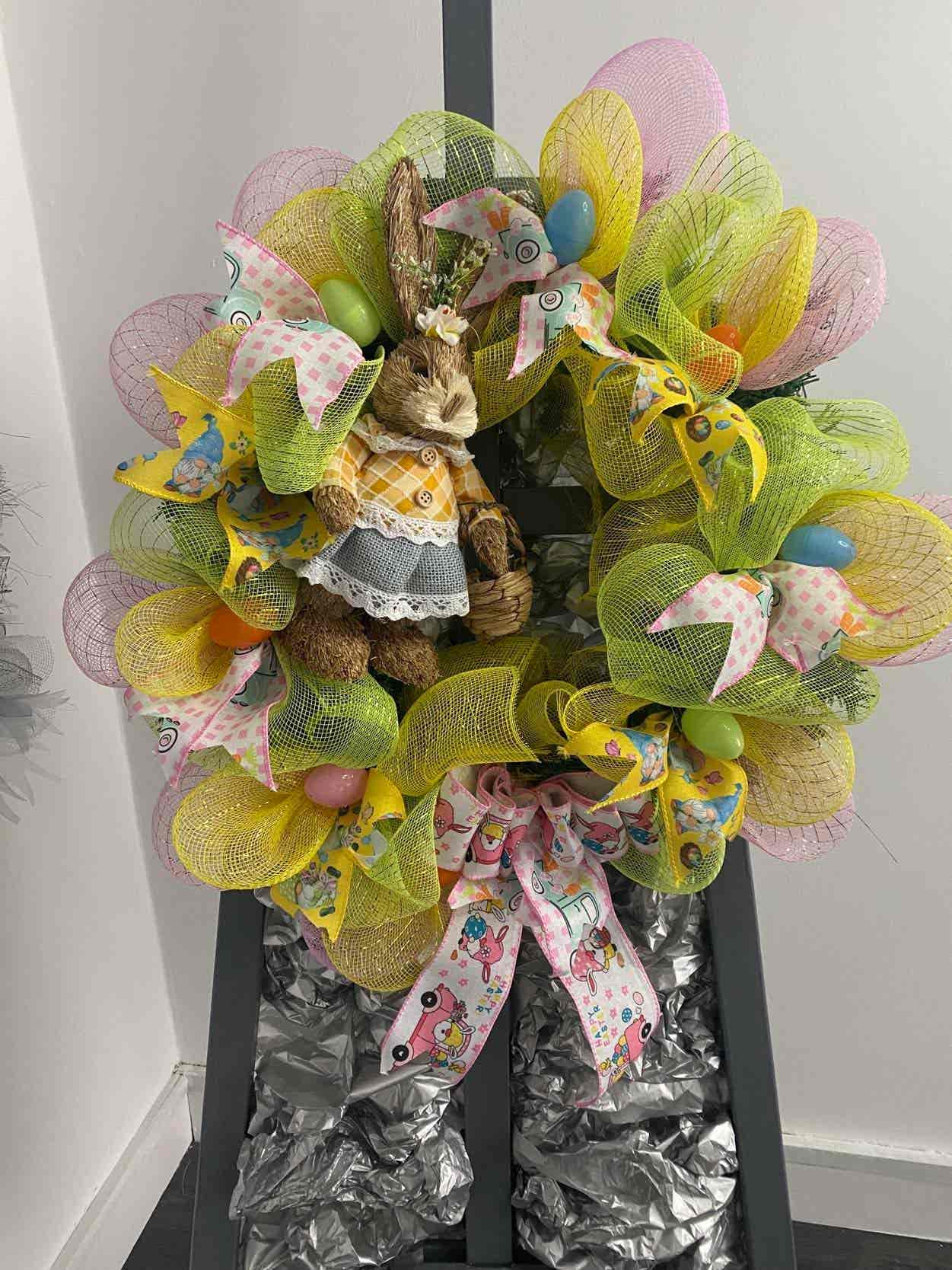 This wreath is the perfect way to add some flair to celebrate the Easter season welcoming the spring season. This Woven Bunny Easter Tales  deco mesh wreath is perfect for the all your Easter celebrations adding  flair to the décor on the front door, sitting room or weather permitting Easter Sunday garden party with family and friends to welcome to new Spring season.
