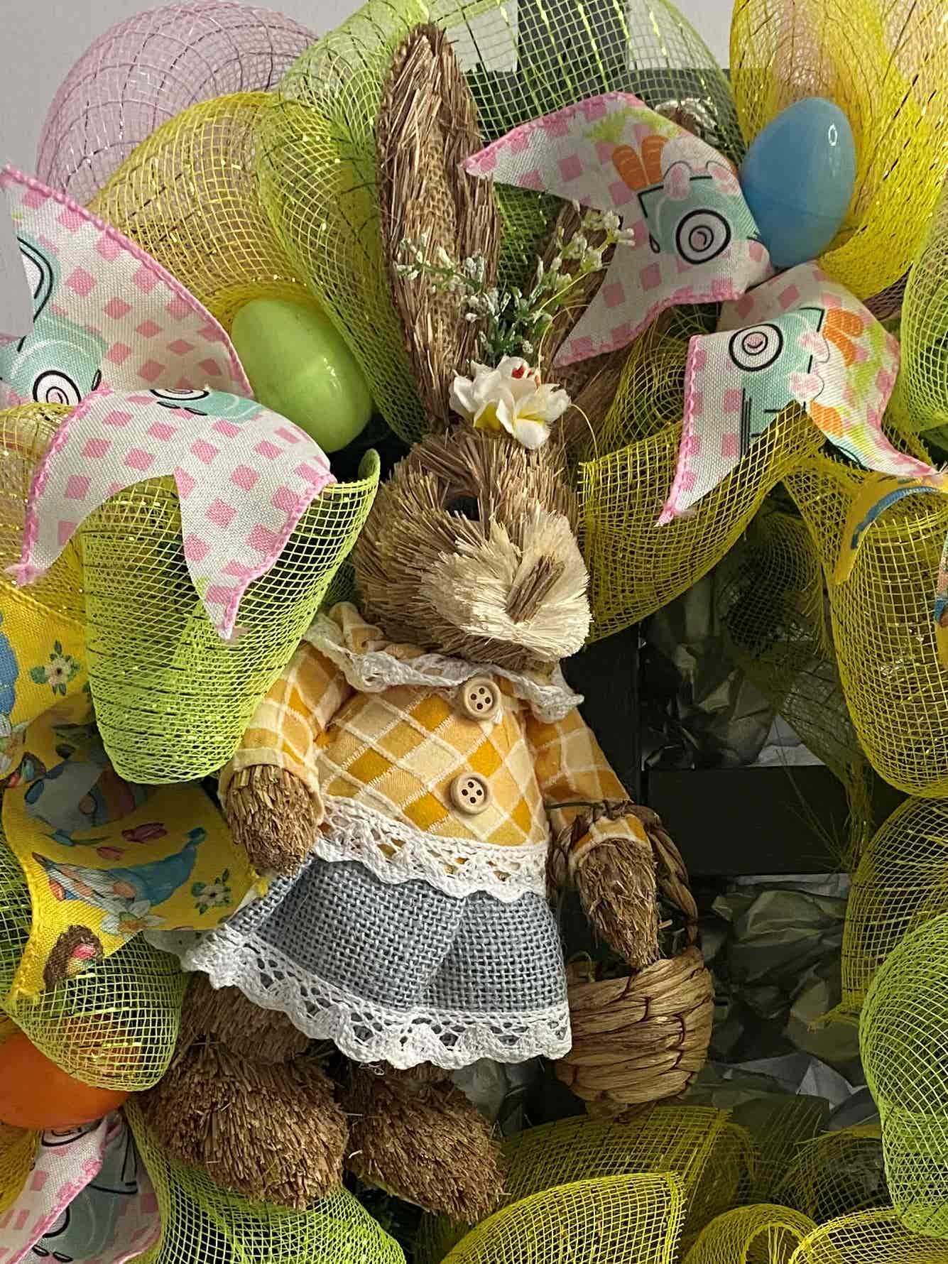 The wreath is adorned with gorgeous centrepiece housing a rustic straw bodied female Easter bunny rabbit carrying her wicker basket embraced with lemon, soft green and pink mesh with Easter ribbon tales along with a traditional Easter gnome bow offering softness to this wreath.