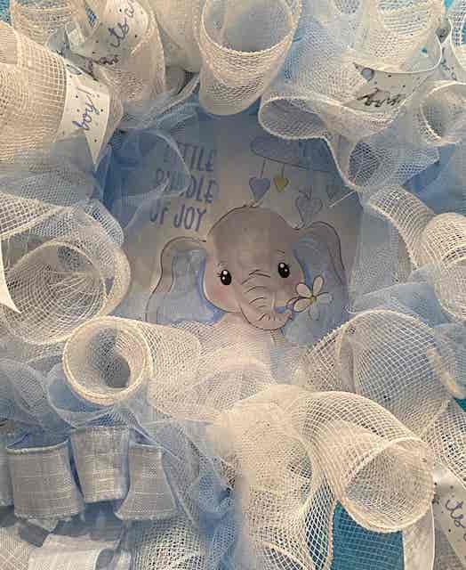 The wreath is adorned with gorgeous soft blue and white tones through the mesh and its a boy themed ribbon tales along with a baby blue and white gingham bow offering softness to this wreath. The centrepiece of the wreath houses a beautiful little bundle of joy elephant acrylic decal which really tops this New Baby Boys wreath off with style.