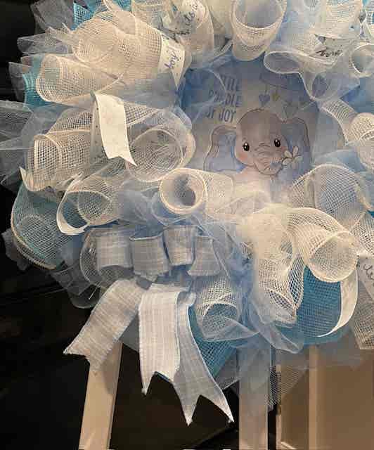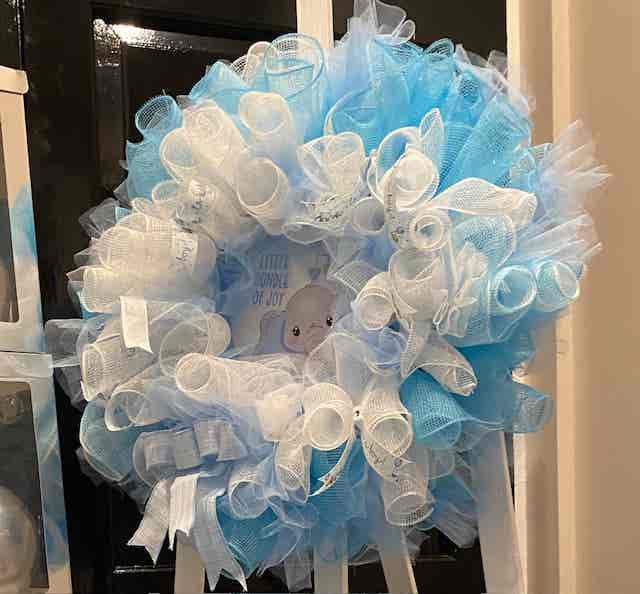 This wreath is the perfect way to add some flair to celebrate the baby’s arrival. This Baby Boy deco mesh wreath is perfect for the new Mum and Babies homecoming from hospital or to celebrate a home birth, 1st visit to welcome the New Baby Boy into the world. This New Baby wreath will add flair to the décor on the front door, sitting room and especially a special keepsake for the nursery with the gorgeous softness from the colours and patterns don’t miss out on the opportunity to make the new parents house stand out showing off the new arrival to the family.