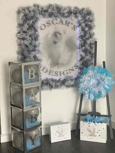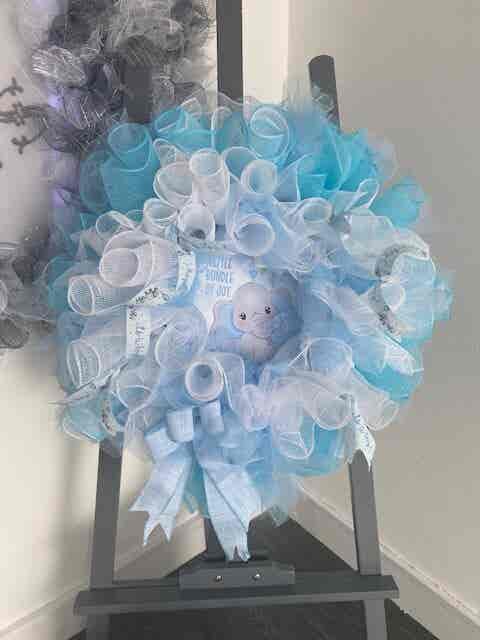 This beautiful wreath in traditional Baby Blue colours can be made bespoke to each customers specification with regards to colours used in main body of wreath, ribbon colour, styles and floral embellishments used to enhance the wreaths styling or it can simply be purchased as it is shown in the pictures.  It could be purchased replacing the little bundle of joy acrylic decal and replaced with personalisation of centre using a baby blue themed backdrop with vinyl message specific to the order. Or it can simply be purchased to be designed as near as possible to what is shown in the picture as each wreath is hand crafted to be a totally bespoke piece.